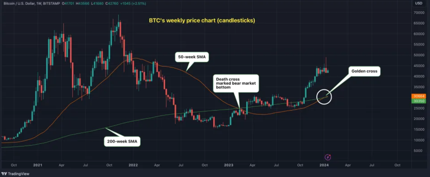 Many traders view these crossovers as indicators that provide insight into future market trends. In this case, the golden cross is seen as a signal for a potential long-term bull market. However, some skepticism surrounds this bullish interpretation. Crossovers are often considered lagging indicators because they rely on historical data, representing past market events. The recent golden cross on the weekly chart, for instance, is a consequence of bitcoin’s impressive 70% rally to $42,700 within a span of four months.