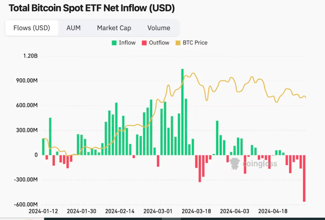 Despite Federal Reserve (Fed) Chairman Jerome Powell dismissing the possibility of a rate hike, investors rapidly offloaded U.S.-based spot bitcoin (BTC) exchange-traded funds (ETFs) on Wednesday. This resulted in a combined net outflow of $563.7 million across 11 ETFs, marking the largest withdrawal since their inception on January 11. The trend continued a five-day streak of losses, with investors withdrawing nearly $1.2 billion from the ETFs since April 24, according to data from Farside.