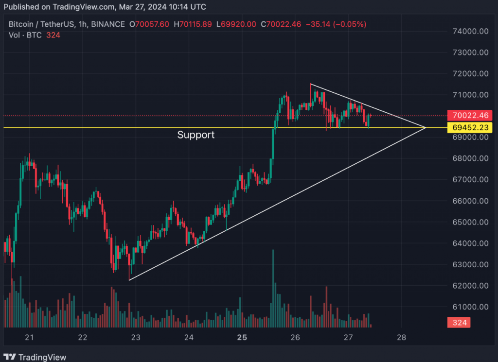 In terms of Bitcoin’s next move, examining the short-term hourly chart reveals a potential bearish pattern forming, with the price hovering around support at $69,450. However, there’s a possibility of an upside breakout if the price remains within the larger triangle and doesn’t drop below $68,000.