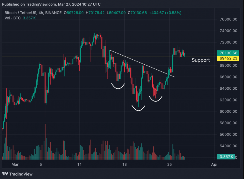 Zooming out to the 4-hour timeframe, Bitcoin appears to be forming a bullish inverse head and shoulders pattern, with the neckline breached upwards. If Bitcoin can reach $74,000 and establish a base range between $69,000 and $74,000, it could signal the beginning of another bullish phase, potentially leading to a new all-time high.