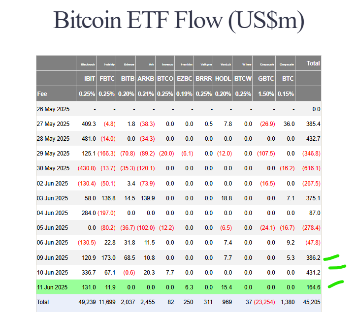 Spot Bitcoin ETFs recorded $160 million in net inflows yesterday, marking three straight days of positive movement. While this shows sustained investor interest, it’s a notable drop from the $435 million seen just a day earlier. The slowdown comes as Bitcoin’s price hovers near $110,000, struggling to break through key resistance.