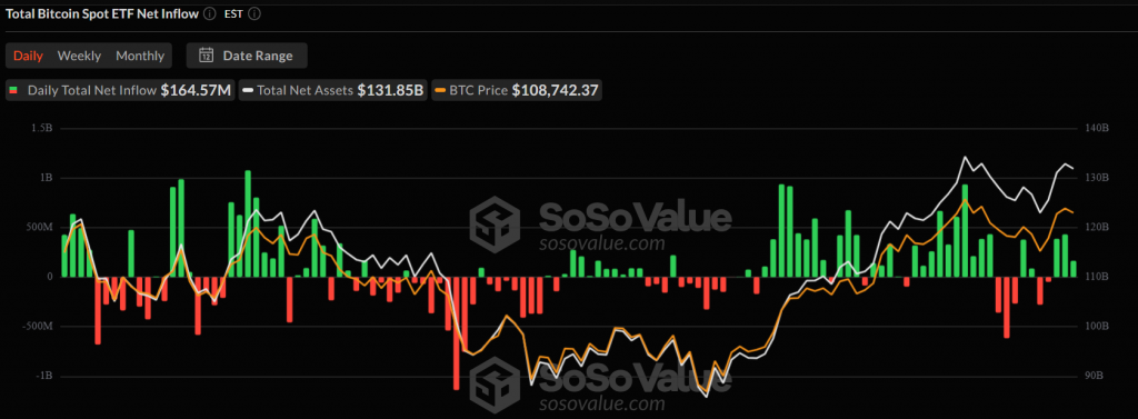 On Wednesday, U.S. spot Bitcoin ETFs pulled in $165 million, down 61% from Tuesday’s $435 million. The decline suggests some hesitation as BTC’s price stalls near $110K, likely due to profit-taking.