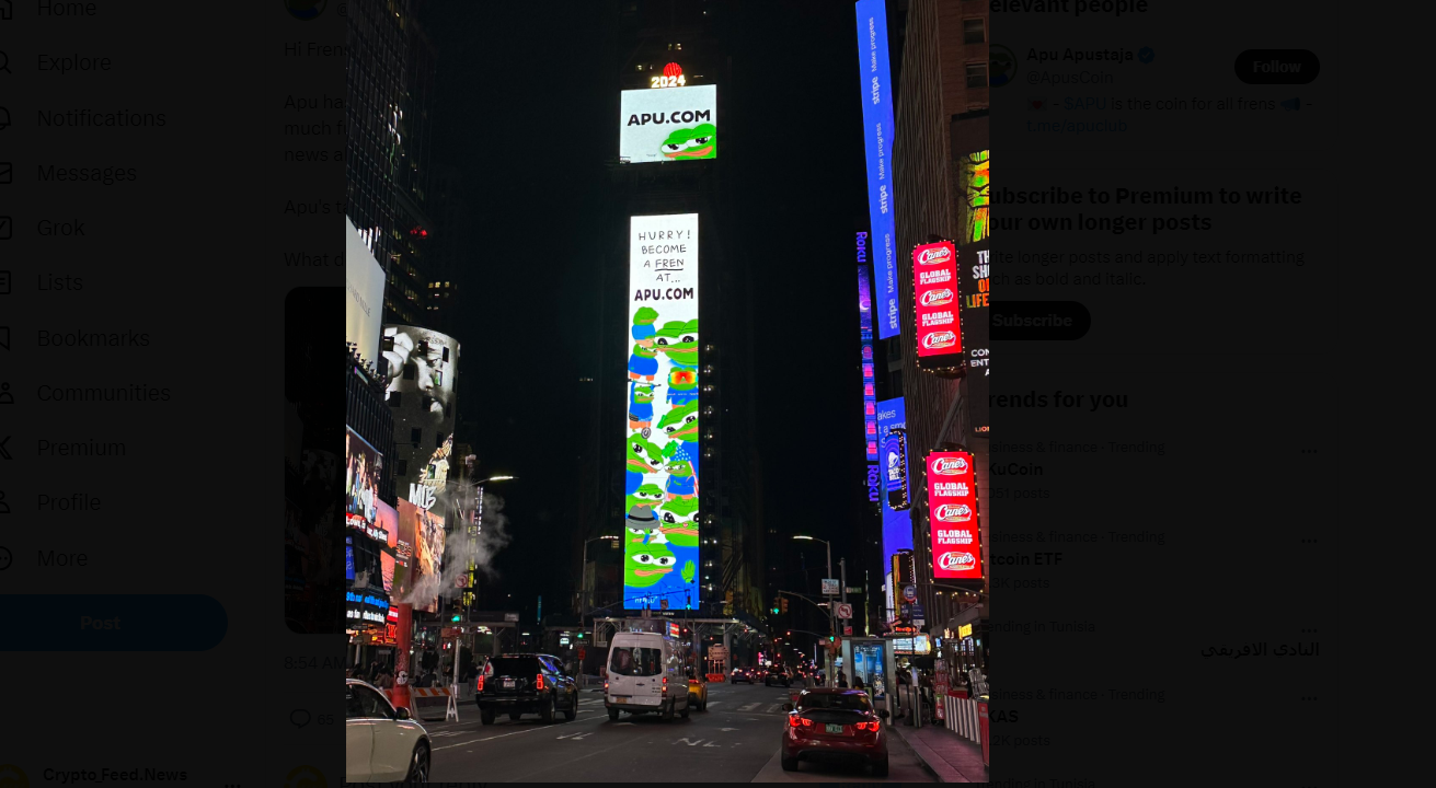 This advertising push across New York’s landmarks underpins an ambitious marketing drive by the Apu Apustaja team to amplify its presence and forge a robust brand image. Complementing the visual spectacle, an integrated effort spans online article features and dynamic engagement across digital platforms like X, Telegram, and Instagram, signaling just the beginning of the roadmap laid out for the community and supporters.