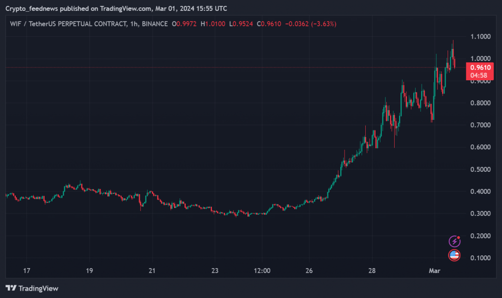 The Solana-based meme token Dogwifhat (WIF) has surged another 10% in the past 24 hours, reaching $1.1 Over the past week, WIF has experienced a remarkable 200% surge amidst a significant rally in the meme coin sector.