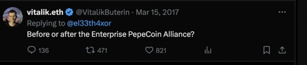 Recently, Ethereum founder Vitalik Buterin showed appreciation for an old tweet about “PepeCoin” from 2017. The tweet, by Emin Gün Sirer, founder of Avalanche (AVAX), humorously mentioned PepeCoin in reference to Ethereum Classic.
