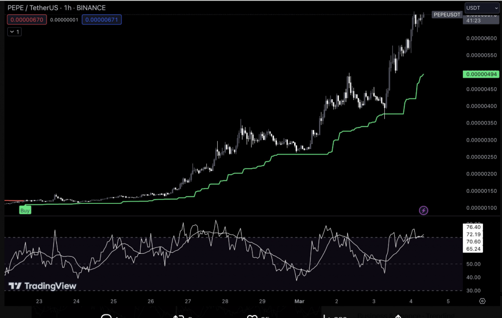 Pepe’s recent performance has been exceptional, with substantial increases elevating tokens into profitable territory. The coin’s volatility is evident, with daily gains exceeding 40%, the second such surge within a week, including a notable 45.62% increase on March 1st.