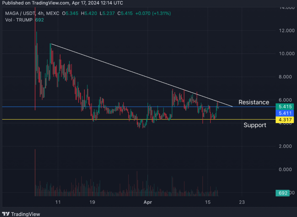 Analyzing MAGA’s price chart reveals a crucial juncture: it’s approaching a convergence point where the downward trend line intersects with the base support. This forms a descending triangle pattern, typically signaling a bearish trend continuation if the price breaks below the base.