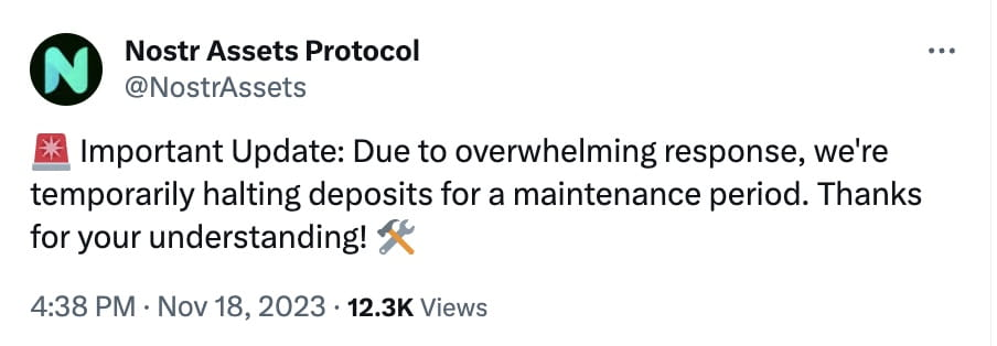 According to a recent update from Odaily, Nostr Assets, a protocol that makes use of the Lightning Network, has revealed the momentary suspension of its down payment feature in response to an unanticipated surge in individual demand. This measure will enable the group to execute necessary maintenance tasks. The information was shared on the X platform.