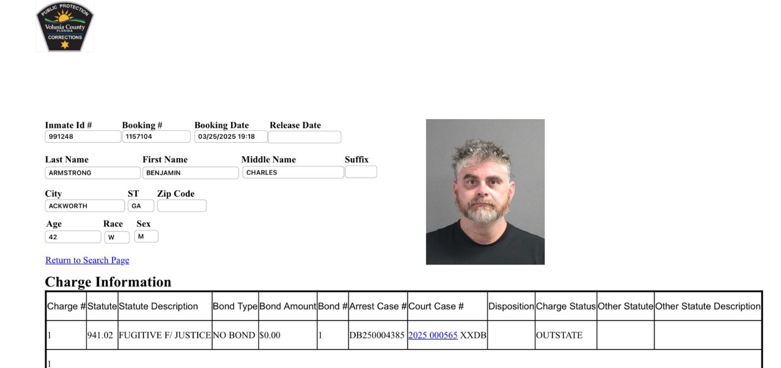 According to the Volusia County Division of Corrections, Armstrong is classified as a fugitive from justice and is currently being held without bail.