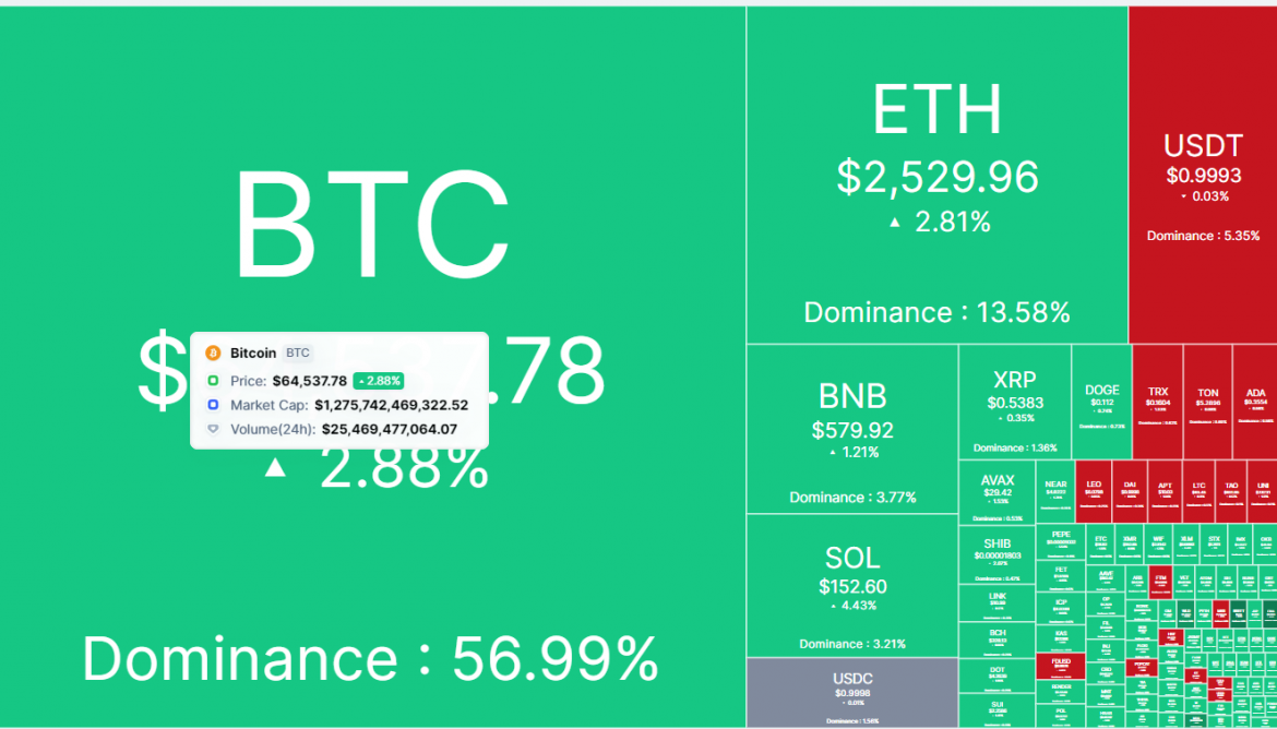 Bitcoin (BTC) surged above $64,000 on Monday, driven by renewed optimism around a possible China stimulus and growing demand for Bitcoin-related assets. In the last 24 hours, BTC saw a 2% rise, with major cryptocurrencies like Ethereum (ETH) and Solana (SOL) also climbing 3%. Meanwhile, XRP and BNB remained flat, but the overall crypto market.
