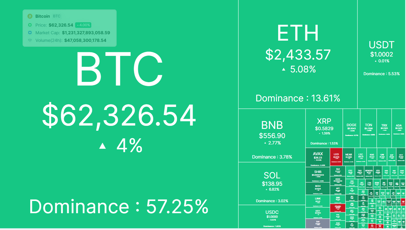 A 50 basis point cut by the Federal Reserve, along with the first Bitcoin purchase by a U.S. presidential candidate, boosted digital assets. Bitcoin (BTC) is currently trading near $62,000, up 2.4% over the last 24 hours. Solana (SOL) led the charge with a 6% increase, while other major assets like BNB, XRP, and ADA saw gains of up to 4.5%. Even memecoins like Dogecoin (DOGE) and Shiba Inu (SHIB) joined the rally with 4% increases.