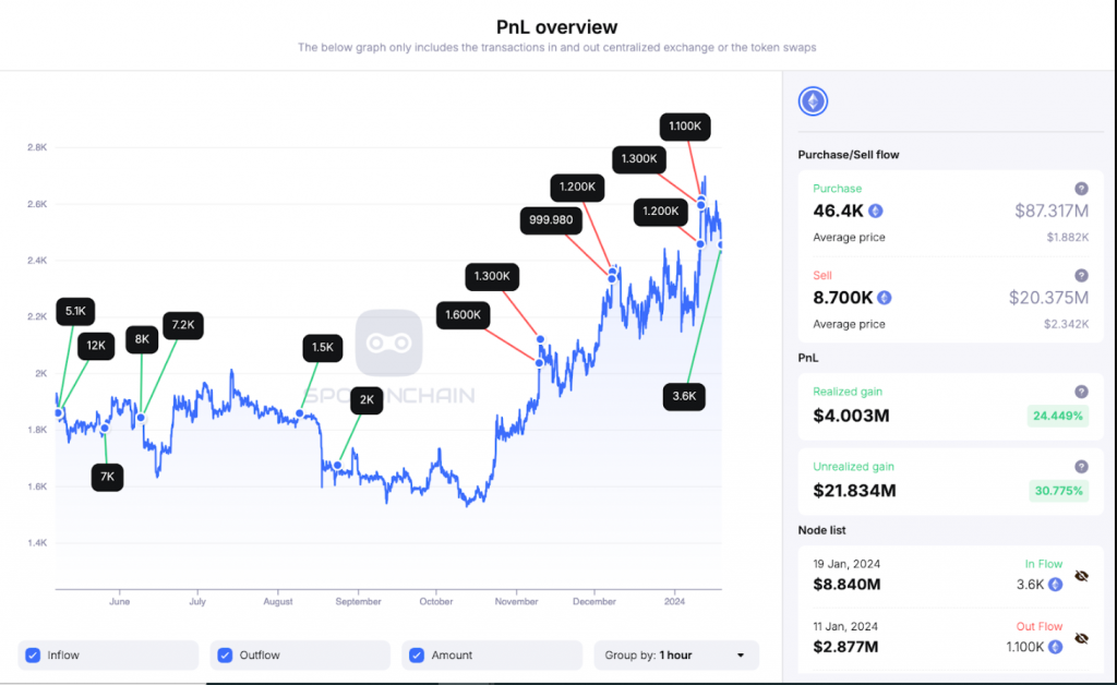 Notably, this whale had been accumulating Ethereum during the market lows of 2023 before the price began its upward trajectory. According to Spotonchain, they withdrew a substantial 42,800 ETH from Binance, with an average cost of $1,834, between May 8, 2023, and August 24, 2023. Despite the market rally in the last quarter of 2023, the whale distributed their assets. However, on Friday, they resumed buying Ethereum.