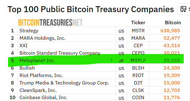 This latest buy brings the company’s total Bitcoin treasury to 25,555 BTC, which is valued at nearly $3 billion at current prices. This monumental accumulation has propelled Metaplanet to become the fifth-largest corporate Bitcoin holder globally, surpassing the holdings of the Bullish crypto exchange.