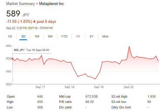 Despite the huge Bitcoin purchase, Metaplanet’s stock price (ticker: MTPLF) experienced a slight dip of nearly 0.50%, trading at 605 JPY.