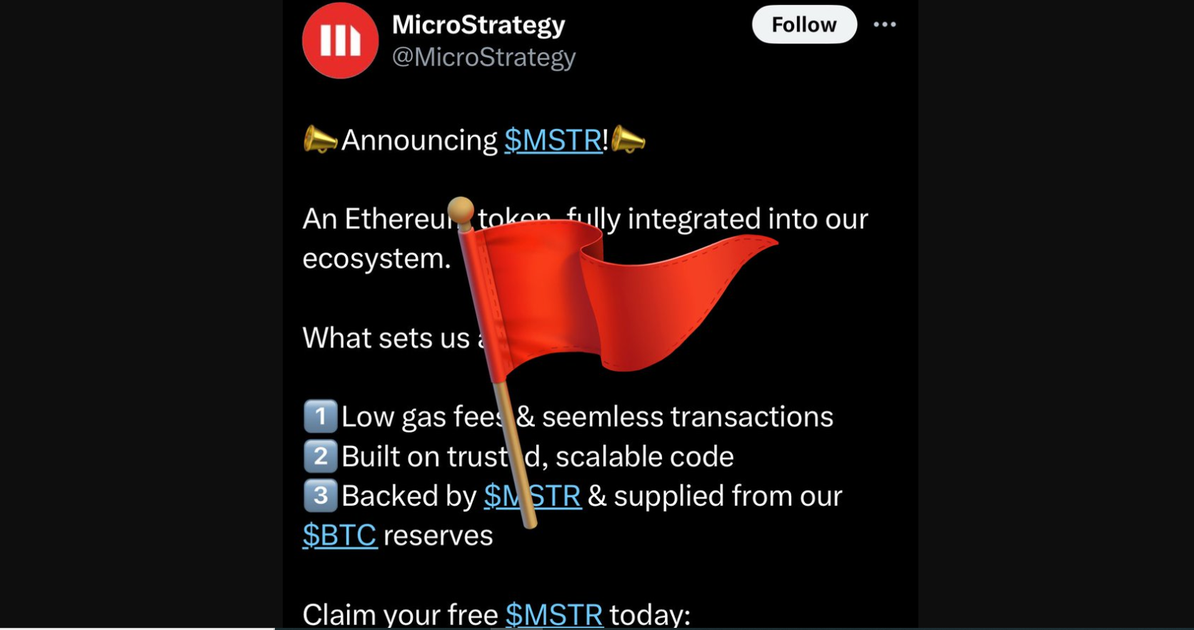 MicroStrategy, a prominent Business Intelligence Firm, faced a security breach on its X account, resulting in hackers posting malicious links promoting a fake Ethereum-based MSTR token airdrop.