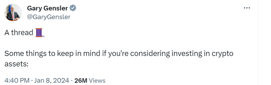 Gary Gensler, the head of the SEC, took to X (formerly Twitter) to caution crypto investors while the fate of spot Bitcoin exchange-traded fund (ETF) applications hangs in the balance. His message on January 8 stressed the risks tied to cryptocurrencies. He highlighted how crypto investment providers might skirt federal securities laws and underscored the exceptionally unpredictable nature of crypto.