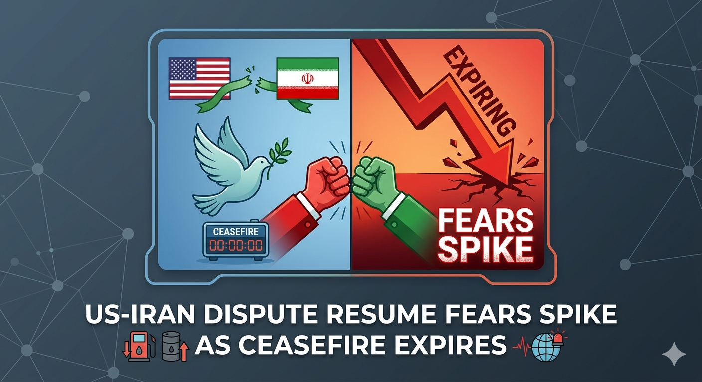 A digital illustration showing a geopolitical conflict graphic with a broken ceasefire dove, clenching red and green hands in a standoff, and a crashing 'Expiring' arrow. The graphic is titled "US-Iran Dispute Resume Fears Spike as Ceasefire Expires".